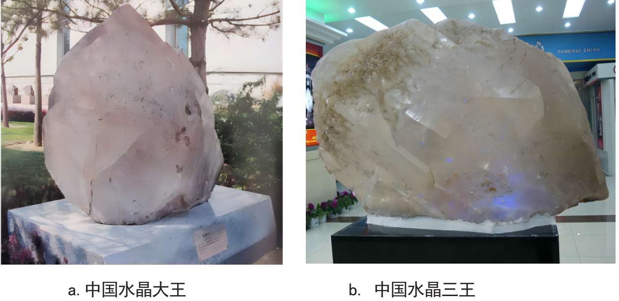 江苏省是中国优质水晶的主要产地,分布于东海、沭阳、新沂等县,特别是东海县的水晶最为著名。早在改革开放前,东海县内已经探明水晶分布面积约700多平方公里,储量约为30万吨,种类繁多,质地纯正,素有“水晶之乡”而闻名于世。1958年冬季,在东海县房山公社社员修水库时,挖出了一块高1.7米、重4吨多的无色水晶,被称为“中国水晶大王”,见图1-2-3(a)。1983年,在东海又采到了一块重达3吨的无色水晶。以上两块较大的无色水晶,陈列于中国地质博物馆。90年代,在东海县再次挖出重2吨的无色水晶,现藏于东海水晶博物馆,见图1-2-3(b)。现在,东海县已经发展成为闻名世界的水晶原料集散地,2003年被中国工艺美术行业组织评定、命名为“中国水晶之都”,2016年又被联合国教科文组织下属的世界手工艺理事会审定、命名为“世界水晶之都”。
