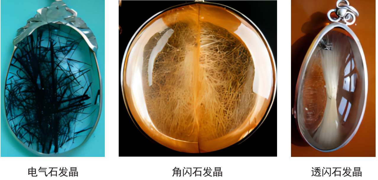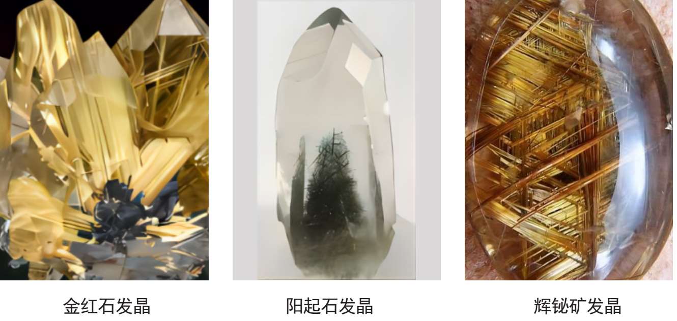 晶体内含有针状、纤维状、发丝状等固体形态包裹体水晶定名为发晶。发晶的品种繁多、形态各异、色彩丰富、寓意美好。发晶按其包裹体矿物名称可分为:金红石发晶、阳起石发晶、辉铋矿发晶、电气石发晶、角闪石棉发晶、透闪石发晶等,如图1-2-18;发晶还可以按颜色分为白色、黑色、红色、黄色、绿色、蓝色等发晶。在民间则把毛发状发晶称为“兔毛发晶”“牛毛发晶”等。