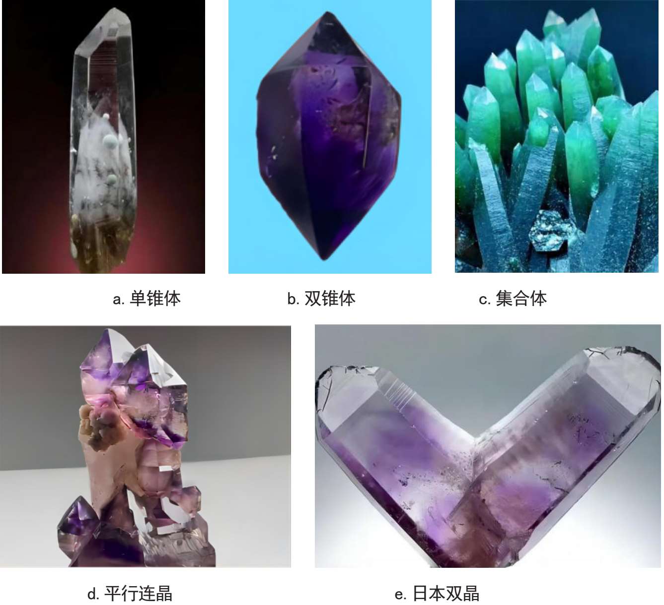 即两个或两个以上的水晶单体按一定的对称规律形成规则连生的水晶。其类型主要分为:日本双晶(膝状双晶)如图1-2-1(e),巴西双晶和道芬双晶。