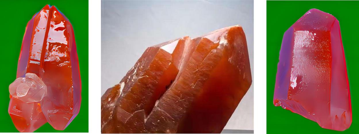 红水晶是一种天然的成分中含有一定微量铁元素而呈橘红色石英单晶体,如图1-2-14。晶体透明至半透明。自然界产出红水晶稀少,尤其优质红水晶更为稀有珍贵。