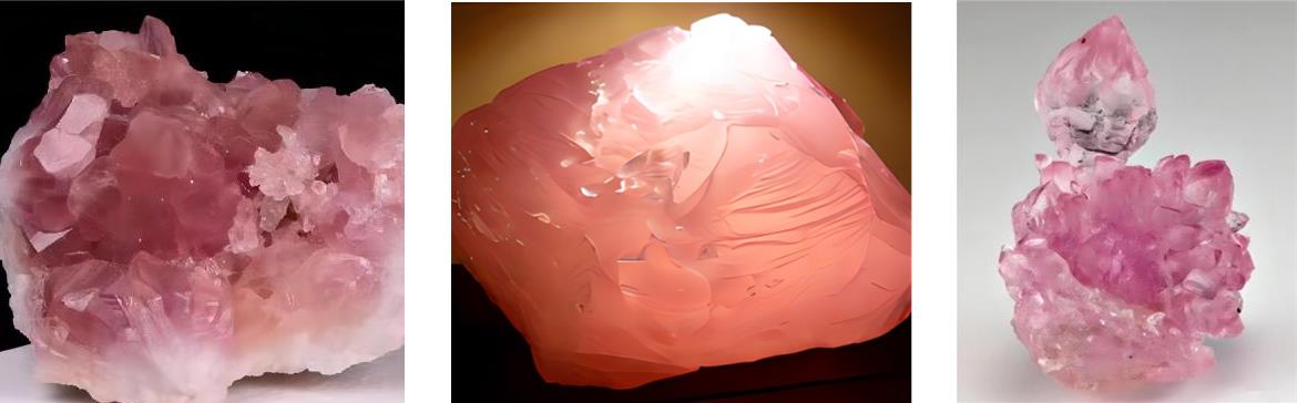 蔷薇水晶亦称玫瑰水晶,因其颜色似蔷薇、像玫瑰而得名。矿物学名称为芙蓉石。民间称其为“粉晶”。一般认为其颜色由Al 3+ 、P 5+ 部分类质同象替代Si 4+ ,形成色心。有人认为蔷薇水晶的颜色,是因含微量Ti 4+ 、Fe 3+ 或Mn 2+ 等而致色。也有人认为蔷薇水晶的颜色,是因Al 3+ 、Ti 4+ 替代Si 4+ 而呈浅玫瑰色。蔷薇水晶颜色不太稳定,当置于空气中加热到575℃时红色消退,在阳光下久晒也能使其颜色变淡,但置于水中其颜色又会稍有恢复。