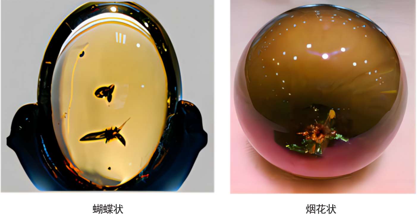 作者在包裹体水晶中发现,凡是包裹锆石的水晶,其晶体的颜色均为烟黄色,而且在锆石的周围都有爆裂纹图案。这可能是因为包体锆石含有一定的放射性元素有关,当放射性元素衰变释放较强能量时,会对无色水晶晶体产生辐射作用,而使其由无色变成烟黄色并在包体锆石周围产生色晕,图案似“蝴蝶”或“蜜蜂”和“烟花”状,如图1-2-7。