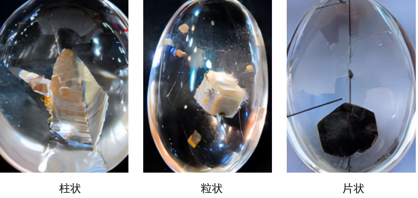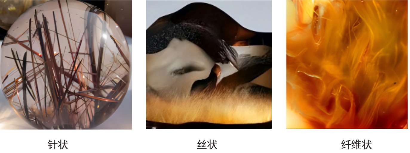 即以固体形态包裹体定名的水晶。固体形态包裹体主要有:柱状、粒状、片状、针状、丝状、纤维状等,如图1-2-17。
