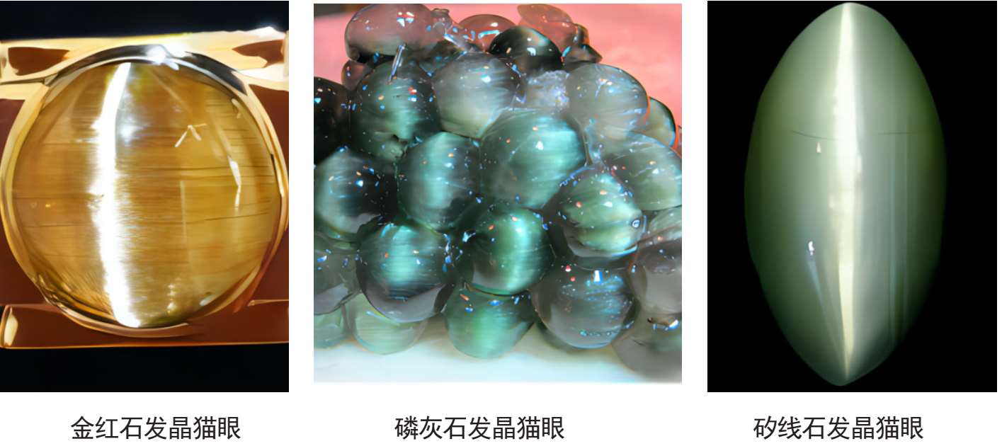 水晶猫眼亦称石英猫眼。是指含有平直密集的发状包裹体的水晶弧面上,在光线照射下,产生可以移动的纤维状光带,犹如猫的眼睛的虹膜现象。例如:金红石发晶猫眼、磷灰石发晶猫眼、矽线石发晶猫眼等,如图1-2-21。