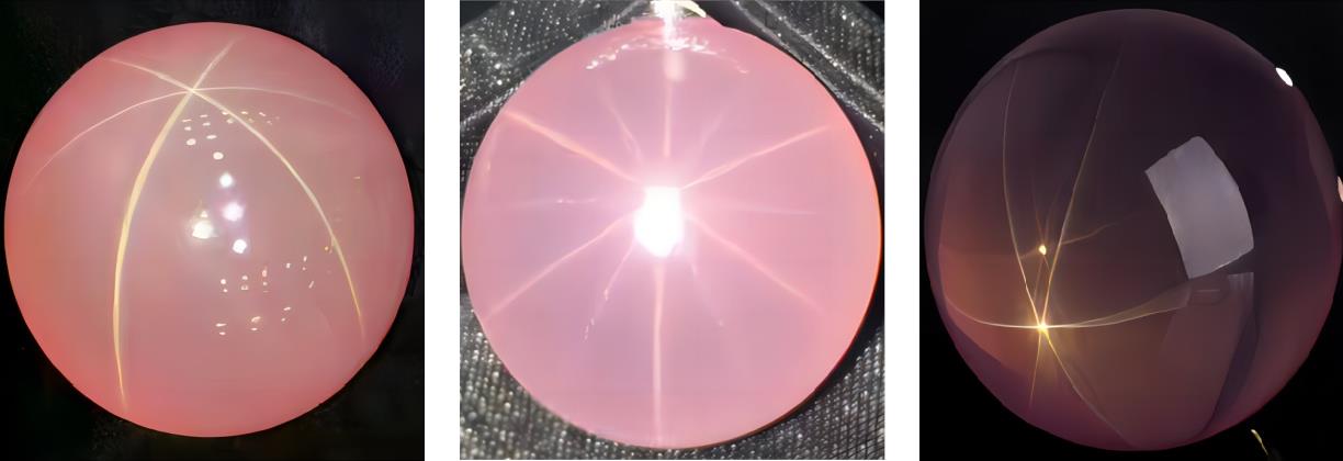 在某些蔷薇水晶中,含有呈显微针状金红石包裹体时,往往在垂直于结晶c轴方向,互作120°交角分布,当磨成弧面型时,能呈现六射星光或十二射星光。若显微针状金红石包裹体细小,晶体有一定透明度,可以显示透射星光。