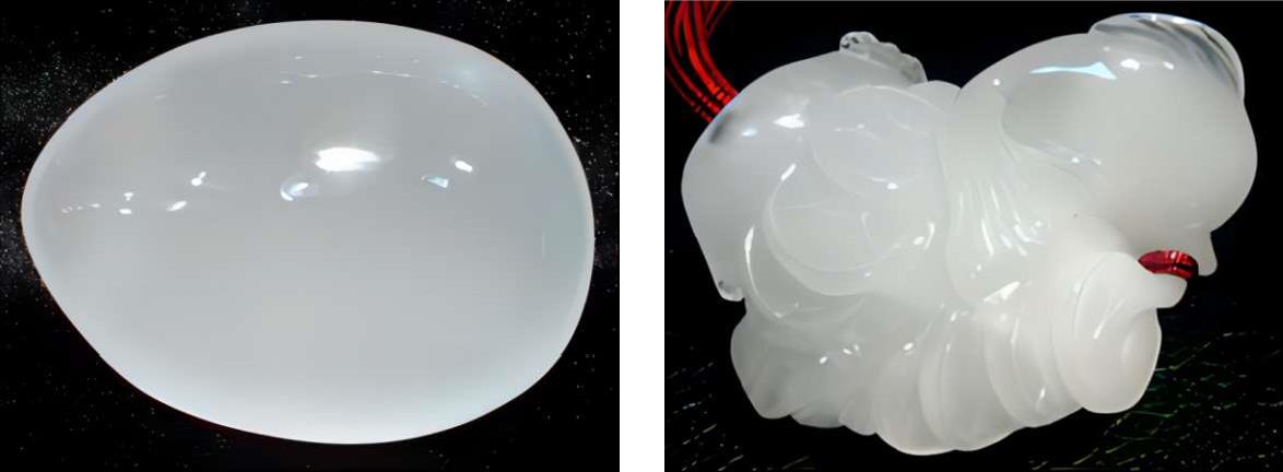 即晶体主乳白色的水晶(图1-2-4)。乳白色是因内含细分散状的气态、液态包体或具微细裂隙或白色包裹体所致;透明度较差,主要是因为结晶时,混入杂质或结晶温度、速度等原因造成的。其半透明的晶体,由内向外透出晶莹温润的淡青色,令人赏心悦目。