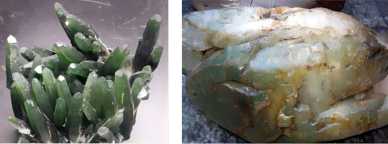 绿水晶是一种稀有的绿至黄绿色的石英单晶体,如图1-211。其绿色由Fe 3 +部分类质同象替代Si 4 +,形成色心(紫→黄的过渡),也与包裹钙铁辉石、阳起石、斜绿泥石和铬云母有关。