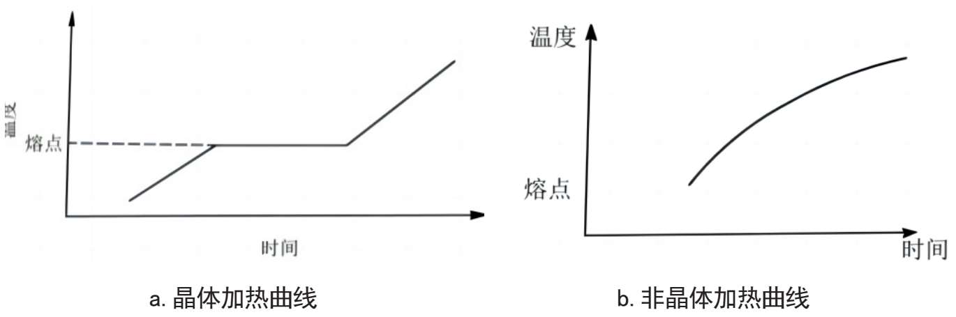 图(b)示意,非晶体与晶体完全不同,表现在整个加热过程中,温度始终是逐渐升高的,没有明显的停顿阶段,直到完全熔化,其加热曲线为一条光滑的曲线。说明非晶体加热时会随温度的升高逐渐变软,最后变成黏稠的熔体,不存在由固相向液相转变的突变点即固定的熔点。