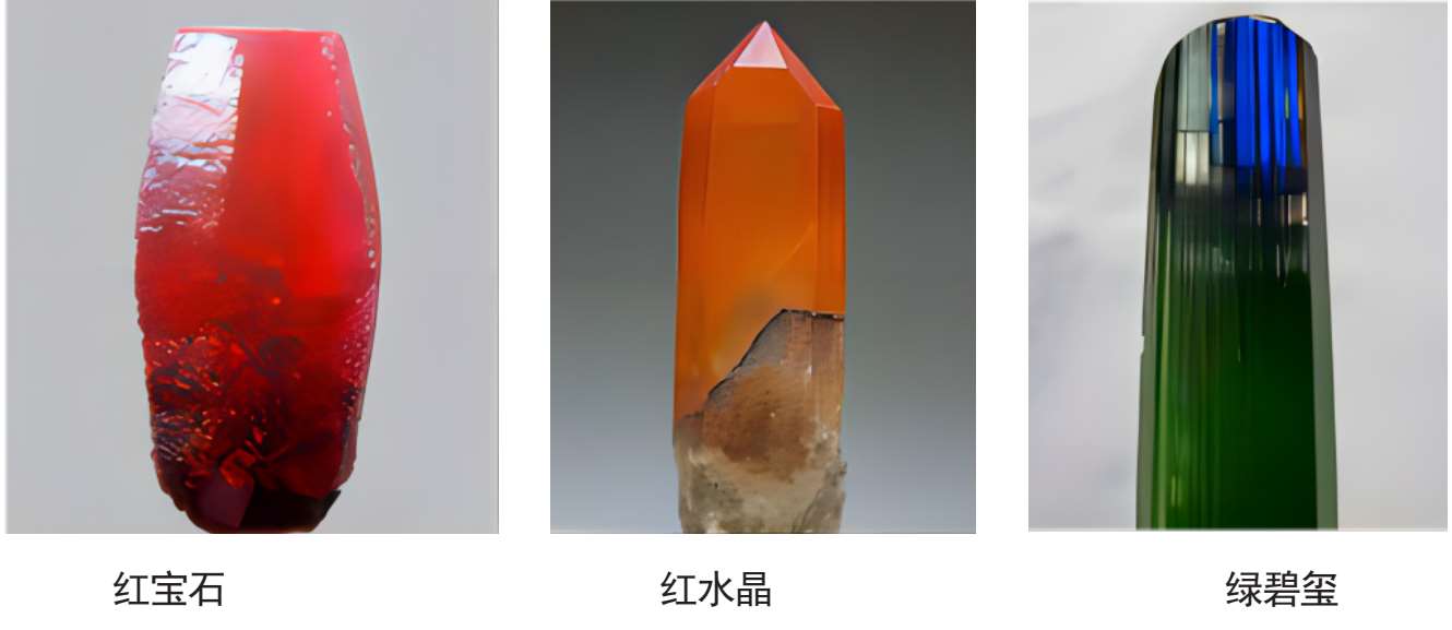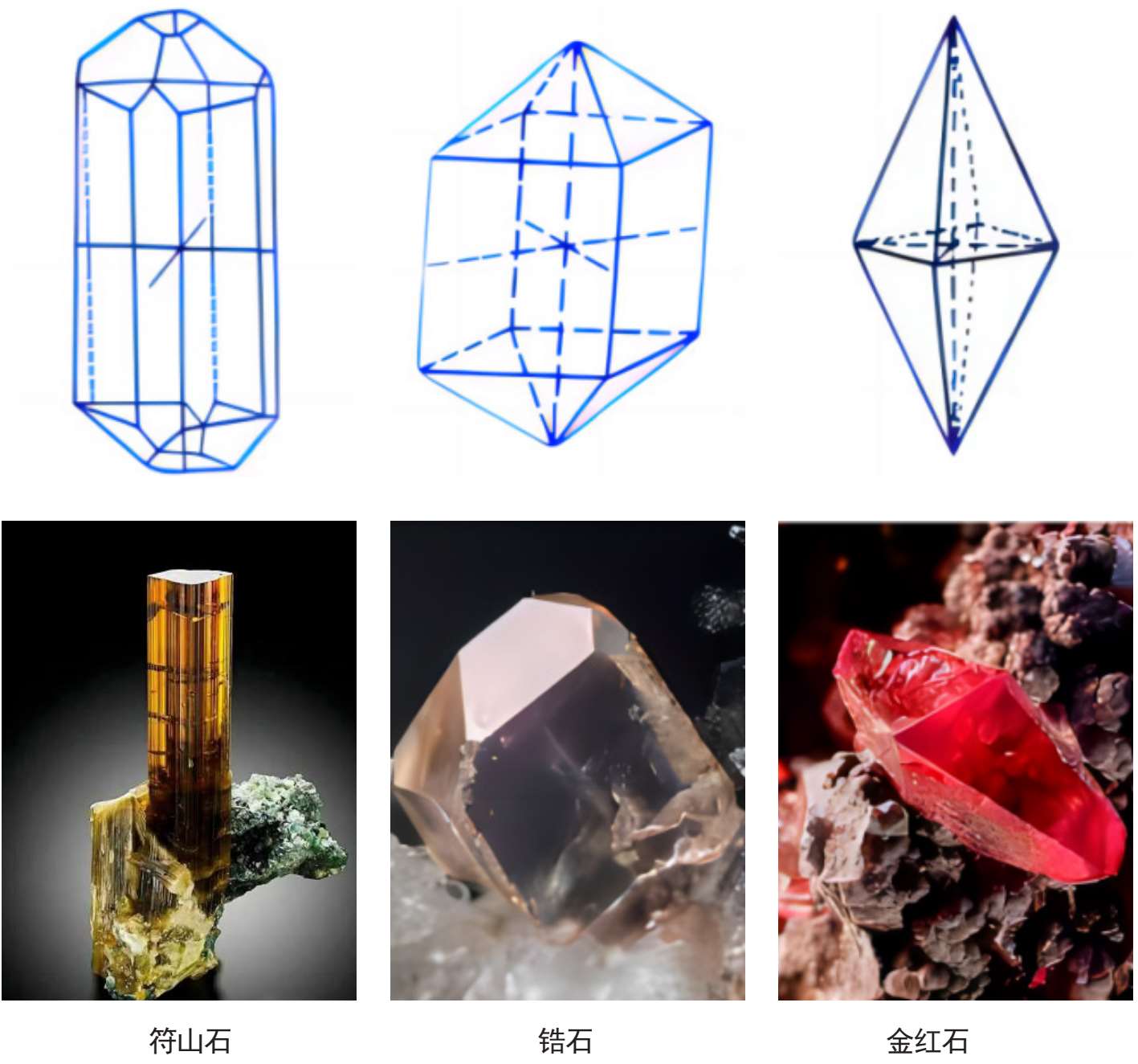 三方晶系的晶体为三方格子构造,有四个结晶轴,其纵轴(Z)与其他三个水平轴(X、Y、U)不相等;三个水平轴等长且彼此间呈120°交角,格子参数为a=b≠c,α=β=90°,γ≠90°。该晶系只有一个高次轴,即三次对称轴L 3 ,最高对称型为L 3 3L 2 3PC,读作1个3次对称轴L 3 (高次轴)、3个2次对称轴L 2 、3个对称面P、1个对称中心C。因其对称程度中等而属于中级晶族,主要矿物有α-石英(水晶、玉髓、玛瑙、碧玉等)、刚玉(红宝石、蓝宝石)、方解石、电气石(各种颜色碧玺)和菱锰矿等,如图2-5-9。