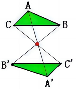 对称中心是晶体内部的一个假设点,以C表示。相应的对称操作是对该点的反伸,即用一个点进行反伸操作(图2-5-3)。如果通过此点作任意直线,则在此直线距离对称中心等距离的两端上,必定可以找到对应点。由对称中心联系起来的两个相同部分,互为上下、左右、前后,均为颠倒相反的关系。晶体具有对称中心时,晶体上的任一晶面,都必定有与之呈反向平行的另一晶面存在,并且对称中心必定位于晶体的几何中心。不是所有的晶体都具有对称中心。要确定晶体有无对称中心时,可将一个晶体如将某晶体平行放在桌面上,看晶体上面是否有一晶面与下面的晶面平行相等。转动晶体重复这样的观察,晶体上所有晶面都可找到与其平行且相等的晶面,说明晶体有对称中心。如果某晶体转动,晶体上的晶面找不到与其平行且相等的晶面,说明该晶体就没有对称中心。