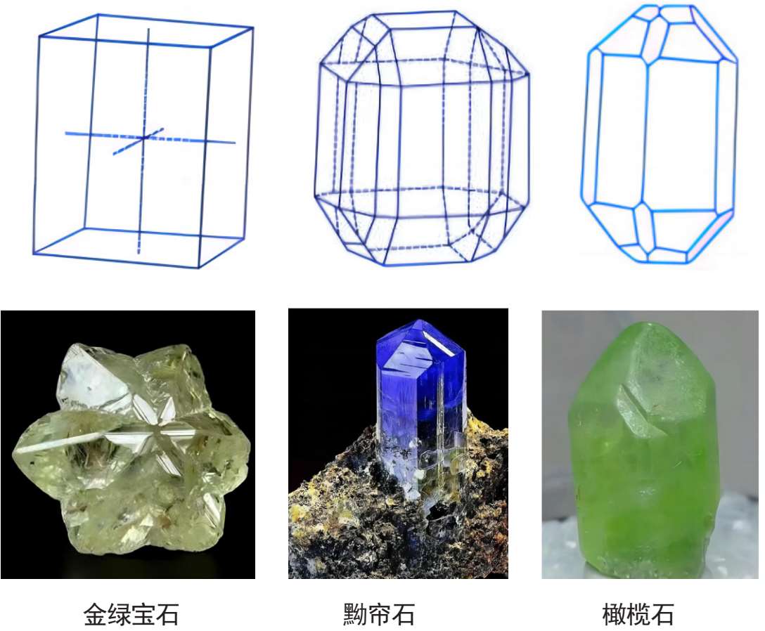 斜方晶系晶体为斜方格子构造,具有三个彼此相互垂直但互不相等的结晶轴,格子参数为a≠b≠c,α=β=γ=90°。纵轴(Z)处于直立状态,水平轴(X、Y)穿过晶体侧面。该晶系无高次轴,最高对称型为3L 2 3PC,读作3个2次对称轴L 2 、3个对称面P、1个对称中心C。因其对称程度低而属于低级晶族,主要矿物有金绿宝石、黝帘石、托帕石、橄榄石、红柱石、堇青石、赛黄晶和玩火辉石等,如图2-5-10。