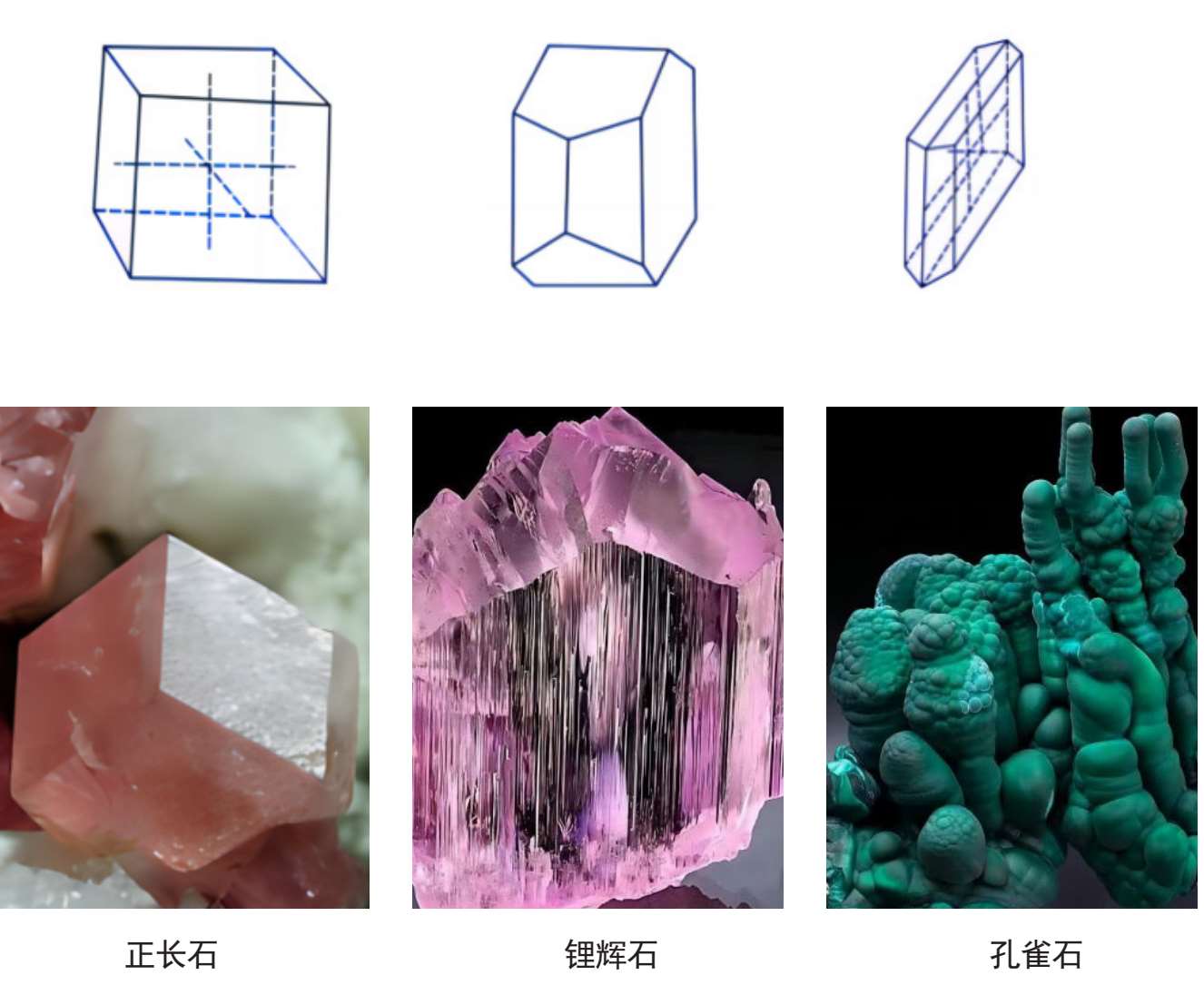单斜晶系晶体为单斜格子构造,具有三个互不相等的结晶轴,Y轴垂直于X轴和Z轴,X轴斜交于包含Z轴和Y轴的平面,格子参数为a≠b≠c,α=γ=90°,β≠90°。该晶系无高次轴,有一个二次对称轴L 2 和不多于一个对称面P,最高对称型为L 2 PC,读作1个2次对称轴L 2 、1个对称面P、1个对称中心C)。因其对称程度低而属于低级晶族,主要矿物有正长石、锂辉石、孔雀石、硬玉(翡翠)、软玉(透闪石或和田玉)、石膏等,如图2-5-11。