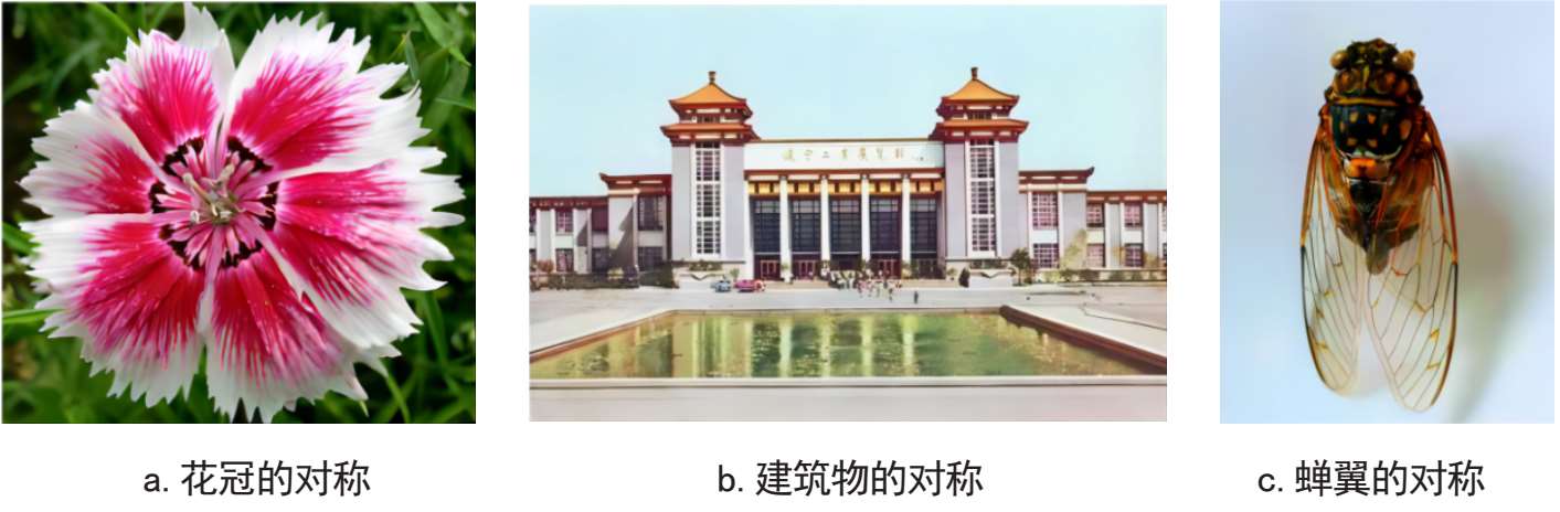 对称是指物体或图形中相同(或等同)部分之间有规律的重复。通俗地说,对称就是物体相同部分有规律的重复。对称是自然界和人类生活中的一种普遍现象,如花冠的对称、蝉翼的对称、建筑物的对称等,如图2-5-1(a、b、c)。