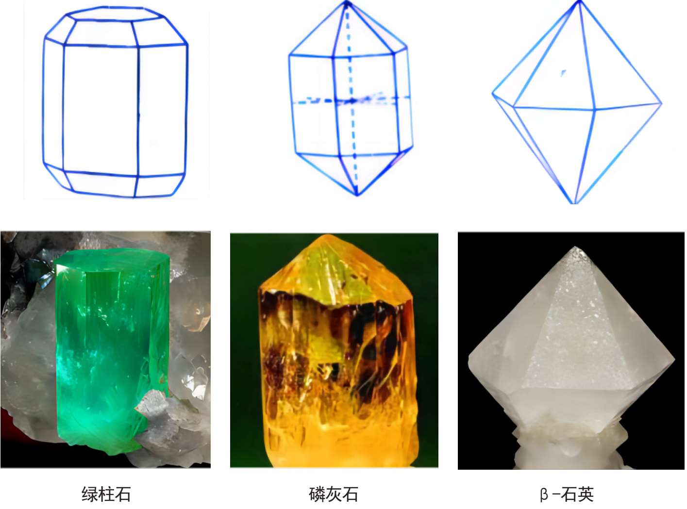 六方晶系的晶体为六方格子构造,有四个结晶轴,其纵轴(Z轴)与其他三个水平轴(X、Y、U)不相等;三个水平轴等长且彼此呈120°交角,格子参数为a=b≠c,α=β=90°,γ=120°。该晶系只有一个高次轴,即6次对称轴L 6 ,最高对称型为L 6 6L 2 7PC,读作1个6次对称轴L 6 (高次轴)、6个2次对称轴L 2 、7个对称面P、1个对称中心C。因其对称程度中等而属于中级晶族,主要矿物有β-石英(高温石英)、绿柱石(祖母绿、海蓝宝石)、磷灰石和蓝锥矿等,如图2-5-8。