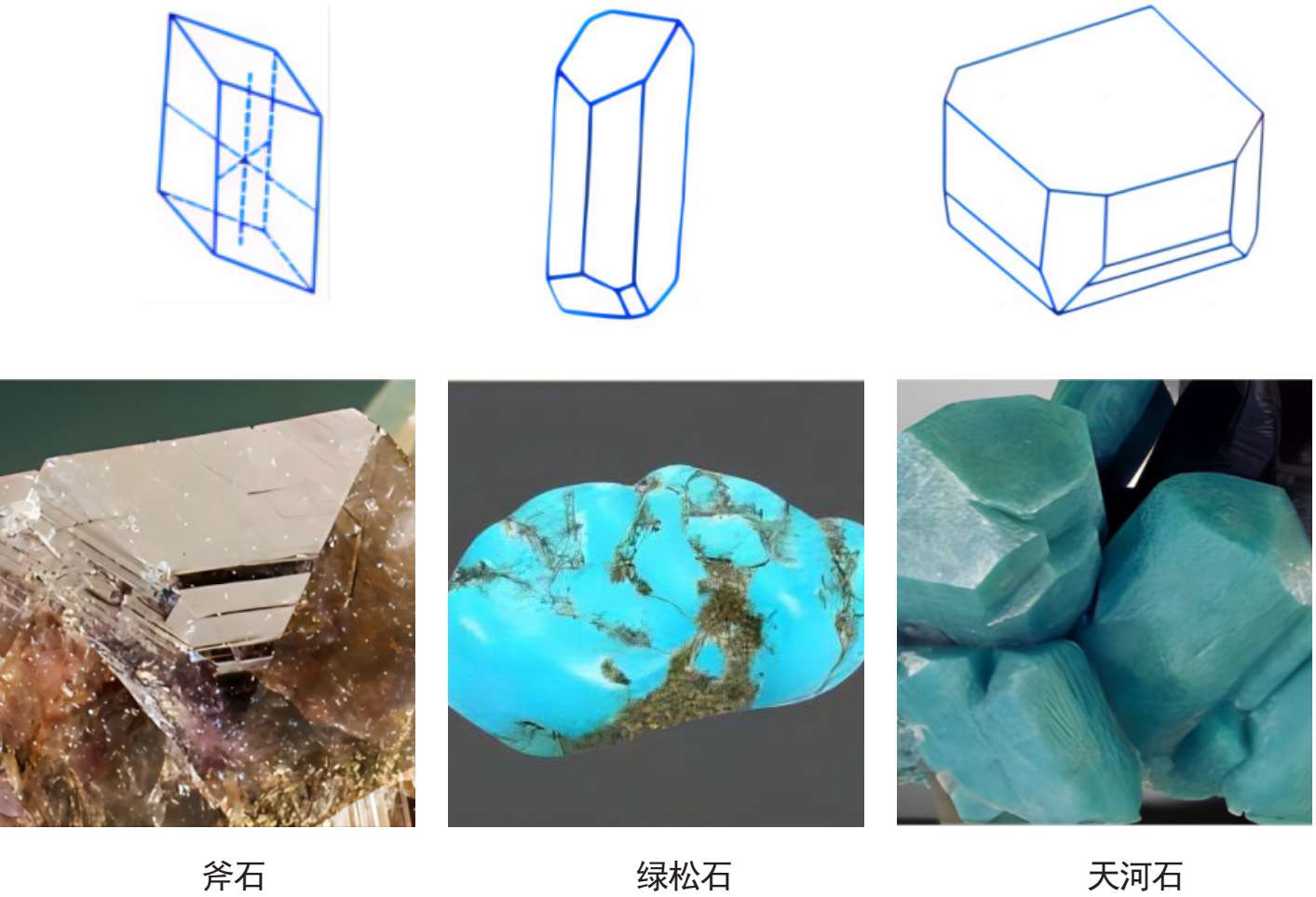 三斜晶系晶体为三斜格子构造,具有三个互不相等且互相斜交的结晶轴,格子参数为a≠b≠c,α≠β≠γ≠90°。该晶系无对称轴或对称面,只有一个对称中心C;因其对称程度低而属于低级晶族;主要矿物有斜长石、绿松石、蔷薇辉石、天河石和斧石等,如图2-5-12。