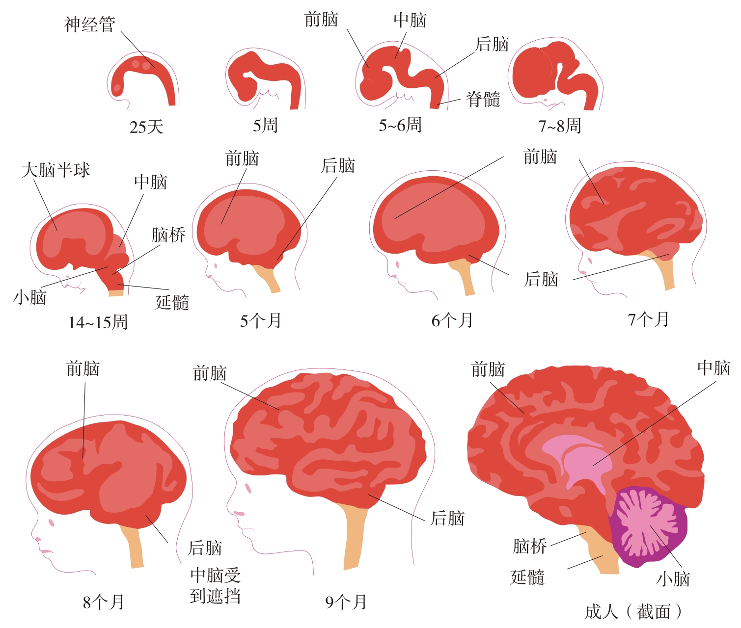 受精约25天后,随着神经管的出现,大脑雏形形成。5周左右,脑干出现,并进一步发育为延髓、脑桥和前脑。5~6个月时,脑干可以支持宫外呼吸。5个月后,中脑就无法作为独立结构被观测到了。延髓的主要结构在7~8周形成。第8周后,脑桥出现。大脑皮层发育最晚,第一道脑沟(皱纹)在20周左右出现。
