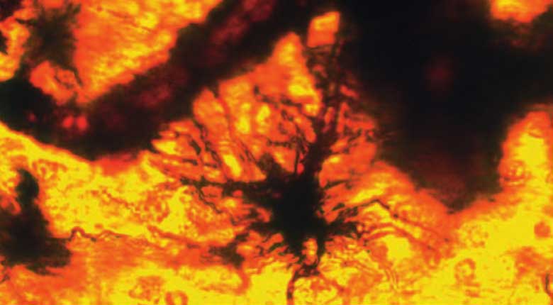 图为星形胶质细胞的扫描图。星形胶质细胞呈星形,为神经元输送营养,并固定神经元。星形胶质细胞还参与死神经元的代谢。
