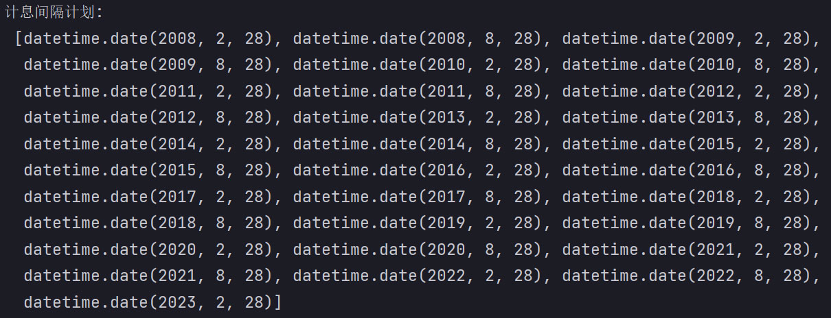 print("计息间隔计划:\n",schedule_test)输出结果: