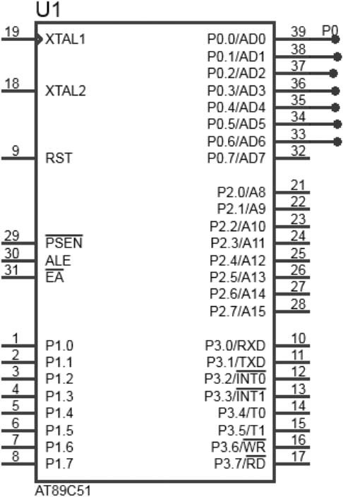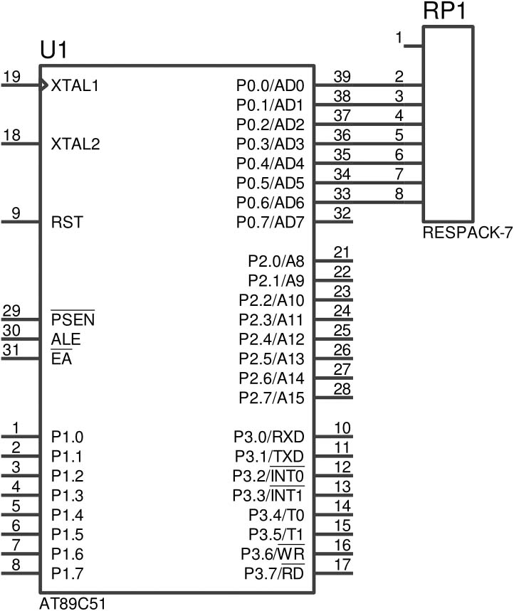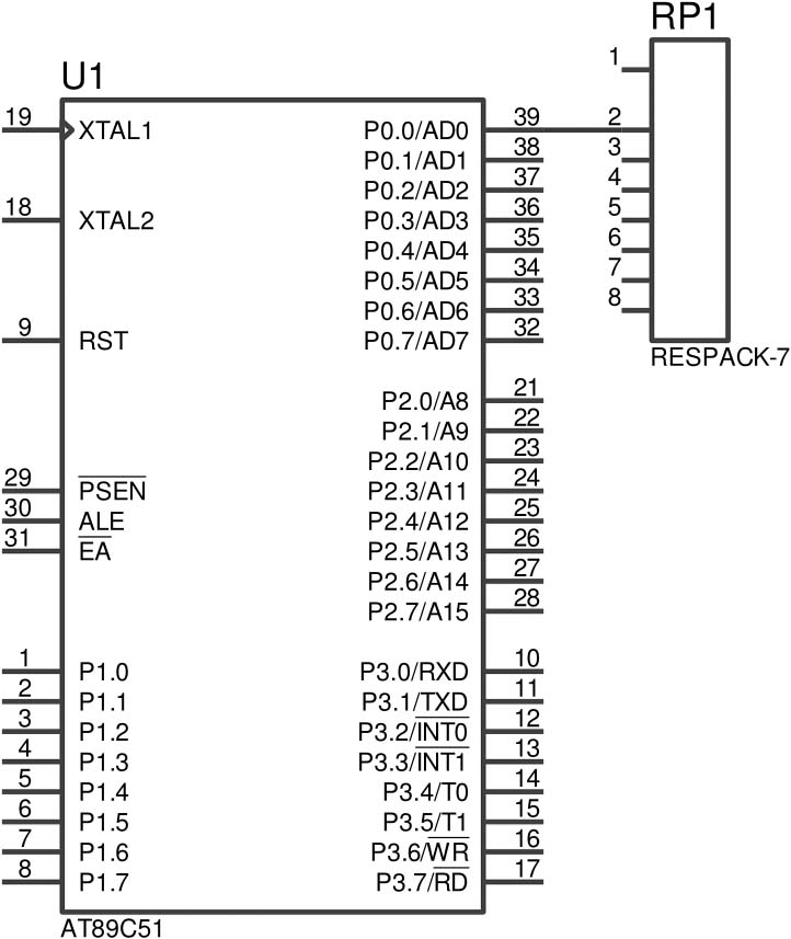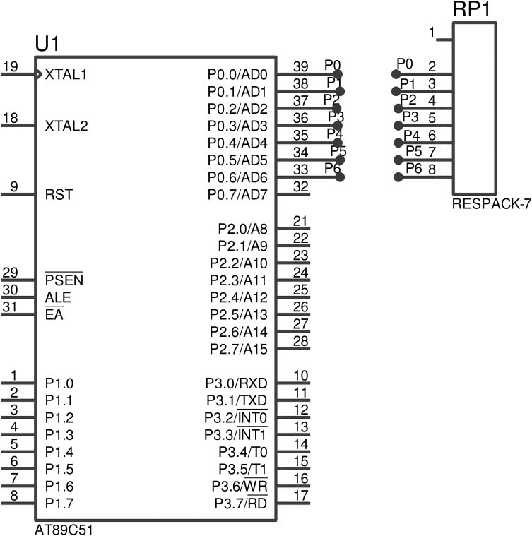 如图2-46所示,首先将P0.0引脚与RP1的2引脚连接。然后将光标移到P0.1引脚上,当光标变为绿色的铅笔形状时,双击就可以实现连线的自动复制,将其他线按照此方法复制,复制完成后如图2-47所示。