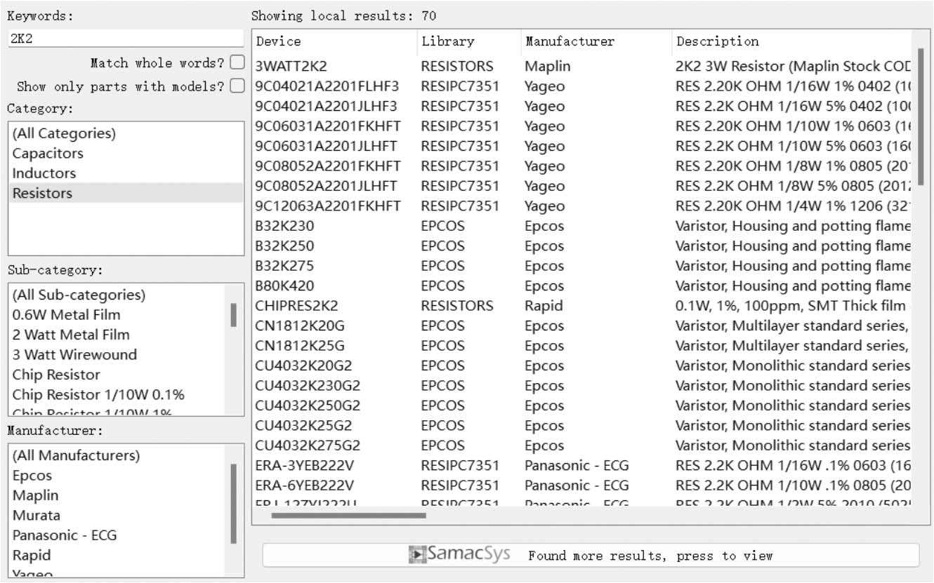 图2-20 在“Showing local results”列表区列出“Resistors”类中包含“2K2”关键字的元器件
