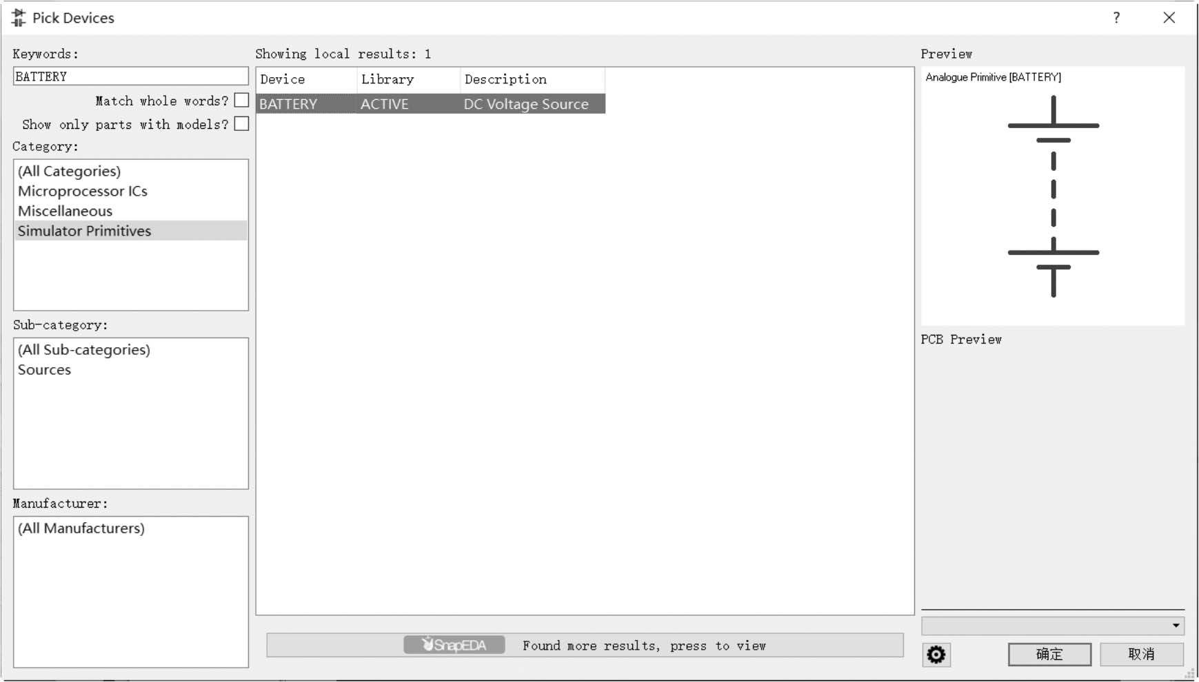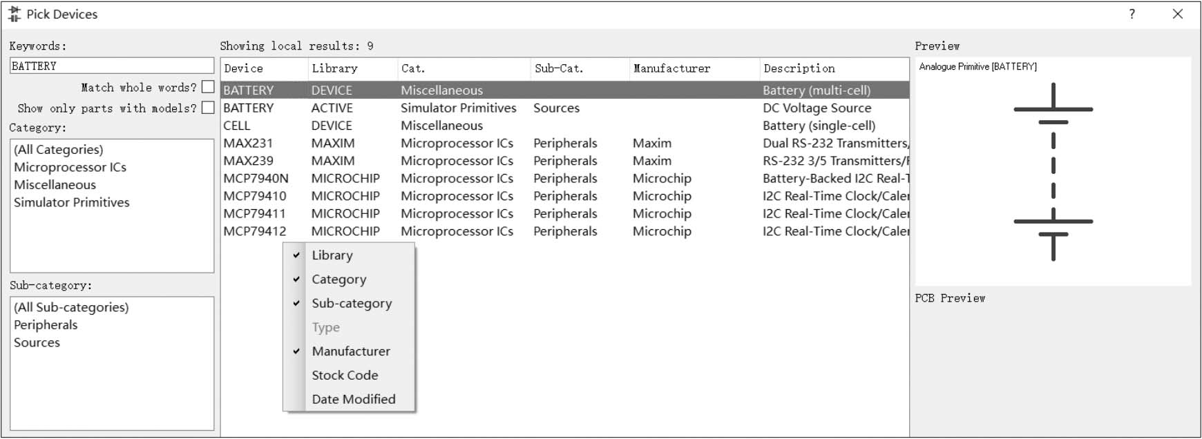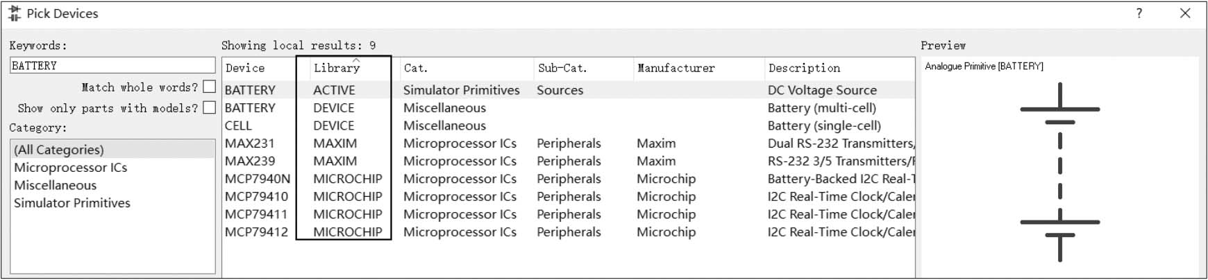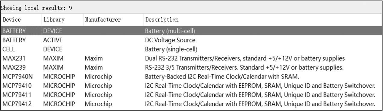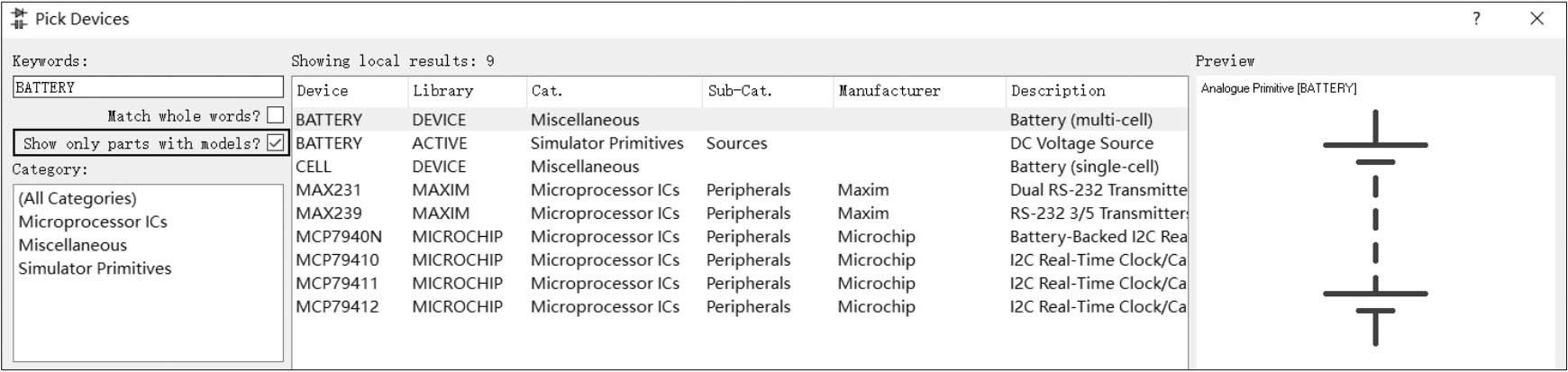 图2-10 在“Keywords”区域输入元器件“BATTERY”后的系统查找结果