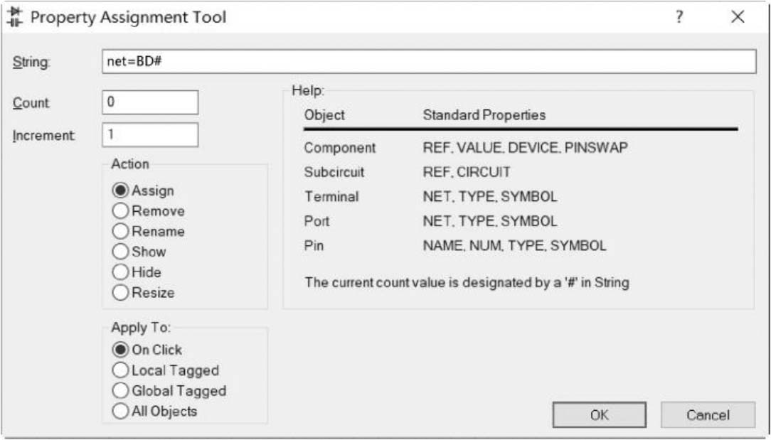 ,或者按键盘上的A键,就会出现如图2-38所示的界面。在该对话框的“String”栏中填写“net=BD#”,其中“BD”为前缀,“Count”栏为起始编号值,“Increment”为编号增量,填写完之后单击“OK”按钮即可完成端口编号批量编写。