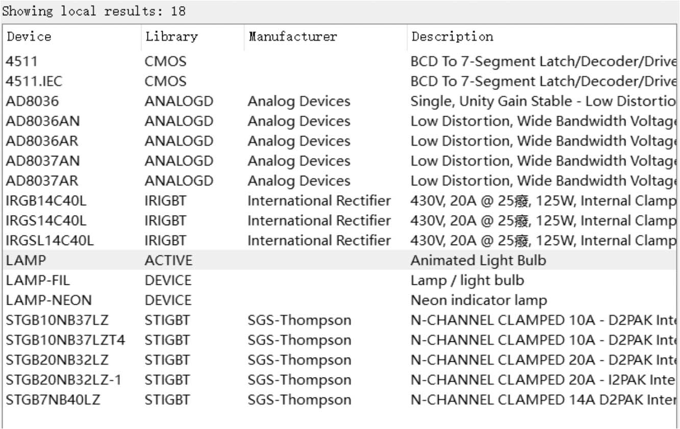 ·通过相关关键字选取元器件:在“Keywords”区域输入“LAMP”,此时“Showing local results”列表区将出现如图2-16所示的信息。