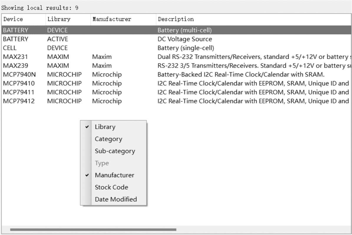 选择相应的选项将在“Showing local results”列表区的标题栏中增加相应的元器件信息,如勾选“Manufacturer”(生产厂家)选项,如图2-13所示。