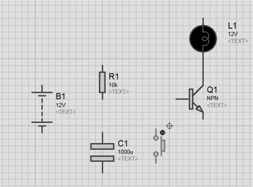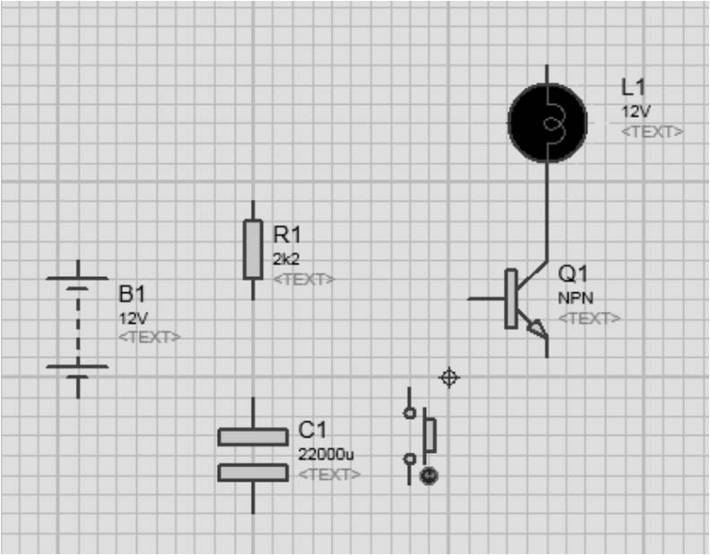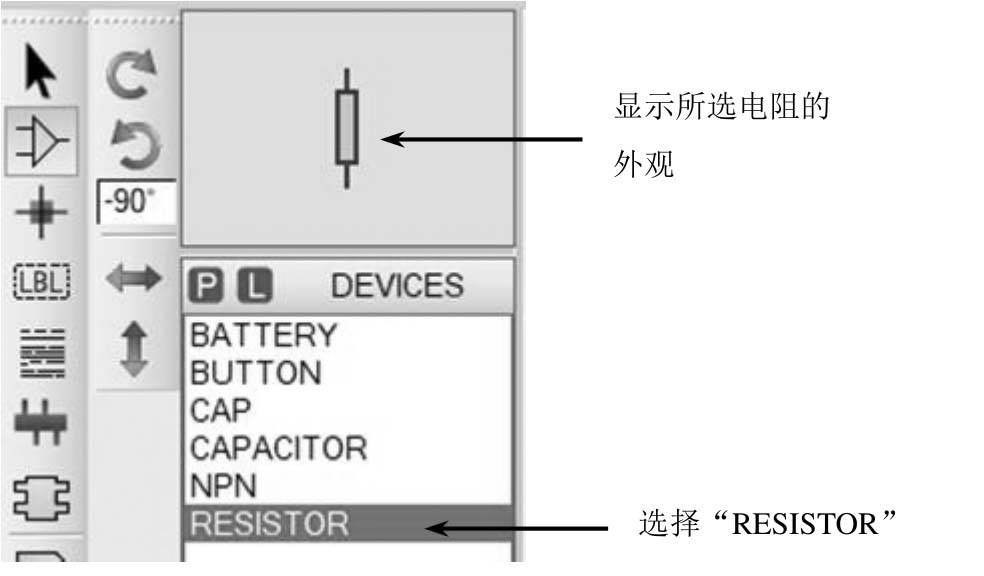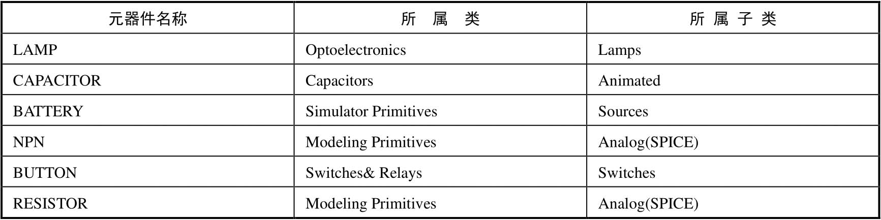 下面介绍一下选取元器件的其他方法,以选取LAMP(指示灯)、CAPACITOR(电容)、RESISTOR(电阻)、NPN(晶体管)和BUTTON(触电开关)为例。