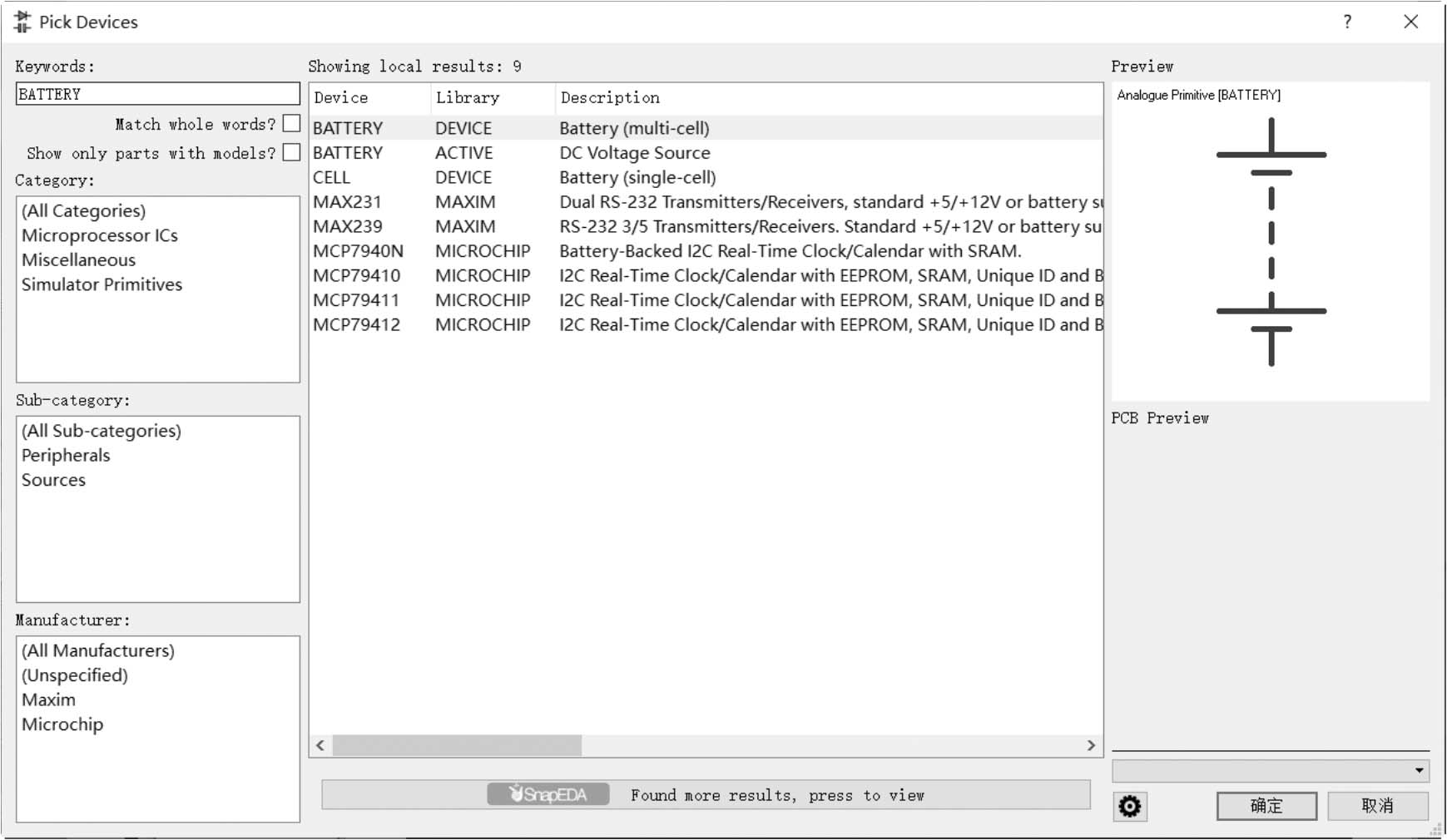 在元器件库查找期望的元器件。PROTEUS ISIS提供了多种查找元器件的方法。当原理图给出元器件名时,在“Keywords”区域输入元器件名,如“BATTERY”,在“Showing local results”区域中将显示出元器件库中的元器件名称或元器件描述中带有“Battery”的元器件,如图2-10所示。
