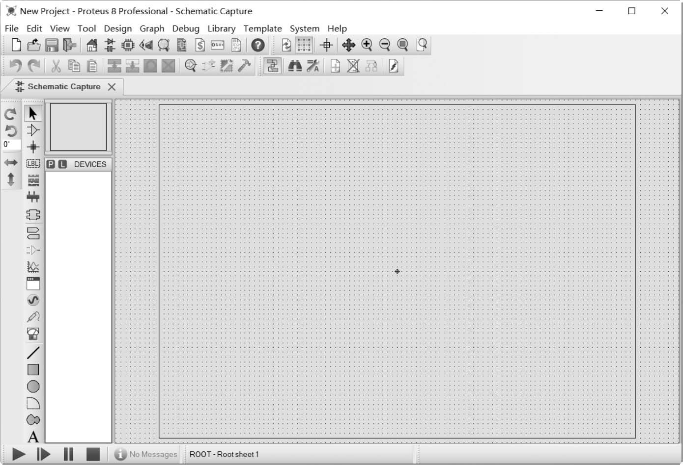 单击“File”→“New Design”,在弹出的模板对话框中选择“DEFAULT”模板,并将新建的设计保存在F盘根目录下,保存文件名为“New Project”。“New Project”设计文档如图2-3所示。