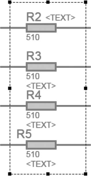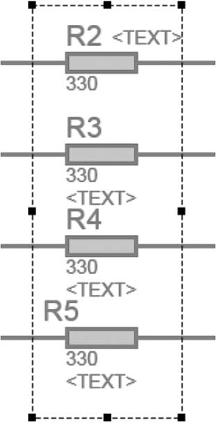 也可以用此操作批量修改电阻电容的参数值,前提条件是这些值是一样的,比如要求批量修改一些电阻的阻值为330Ω,如图2-39所示,选中这几个电阻,按下A键,会出现如图2-40所示的界面,只需要在“String”栏中填写“VALUE=330”,然后单击“OK”按钮即可。批量修改完阻值后的电阻如图2-41所示。