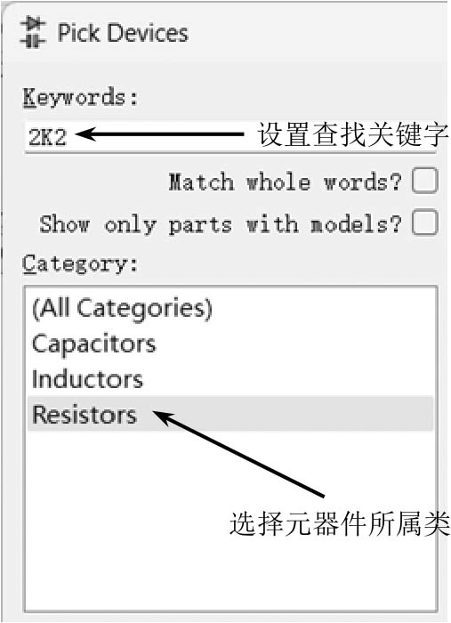 首先在“Keywords”区域输入“2K2”,然后选择“Category”目录中的“Resistors”类,如图2-19所示。