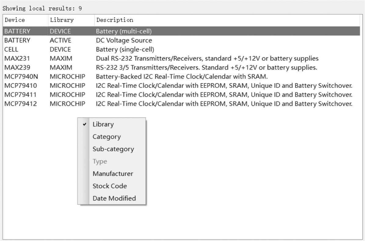 · 结果排序: 单击搜索列表上方的列标题,如Device(元器件名)、Library(库名)等,则相应列表对搜索结果按字母顺序排序,如图2-22所示,Library(库)以字母顺序排列。