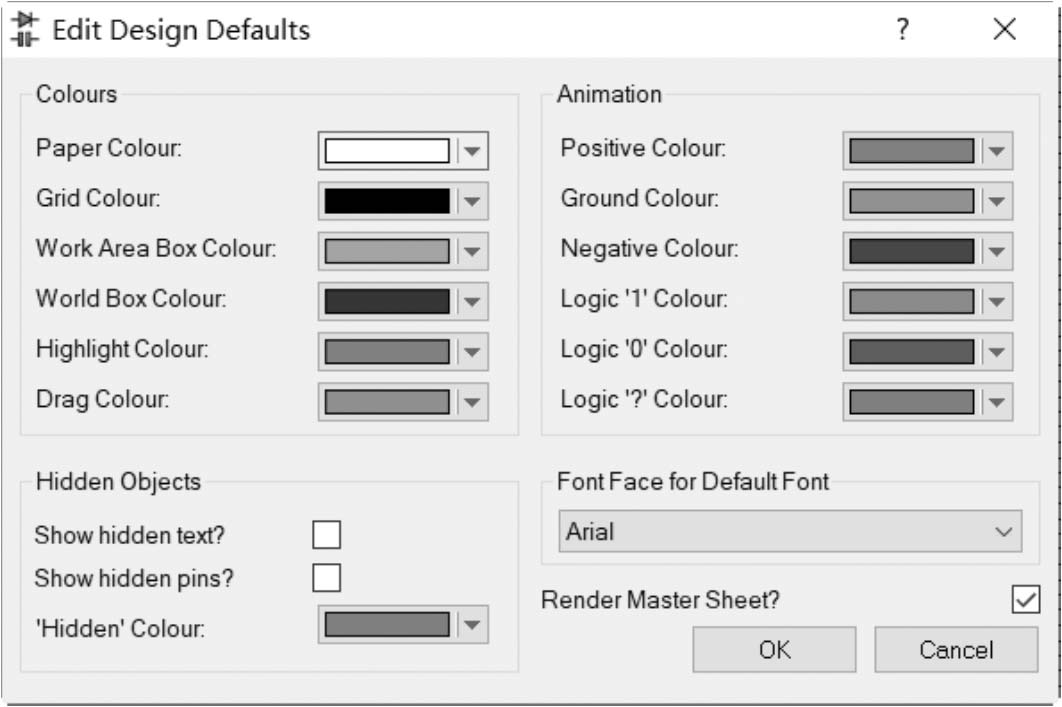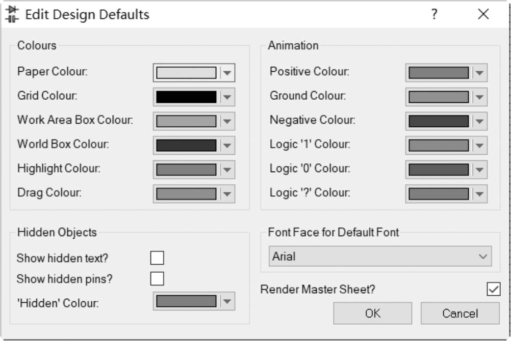 (2) 设置图纸颜色: PROTEUS中的原理图图纸一般默认为灰色,有些时候为了打印或美观,可以将图纸底色设置为白色或其他颜色,单击“Template”→“Set Design Colours”,出现如图2-5所示的界面。