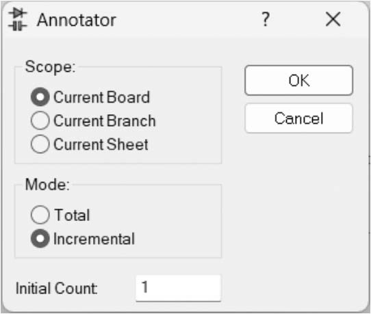 在复制时,为了避免标号重复,要实时对元器件进行编号,此时就要执行实时标号命令,即单击“Tools”→“Global Annotator”,出现如图2-34所示的界面,按图2-34中的参数进行设置,即可实现实时编号。