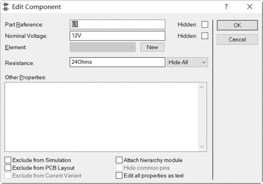 在这一元器件的编辑中,设置LAMP的电压标称值为12V。
