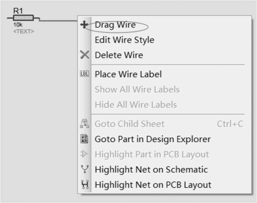 (1)在各种操作模式下,将光标移至连线处且连线中出现高亮时直接右击(或者将光标移至连线处后,单击鼠标左键再单击鼠标右键),在菜单中选择“Drag Wire”即可实现线的移动和拖曳(见图2-45)。