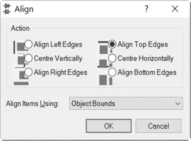 首先选中需对齐的元器件,如图2-35所示。单击“Edit”→“Align Objects”,出现如图2-36所示的对话框,该对话框包括了左对齐、上对齐、居中纵对齐、居中水平对齐、右对齐、底对齐六种对齐方式,这里选择了上对齐,故勾选第2个,完成编辑后,单击“OK”按钮,元器件实现上对齐,如图2-37所示。