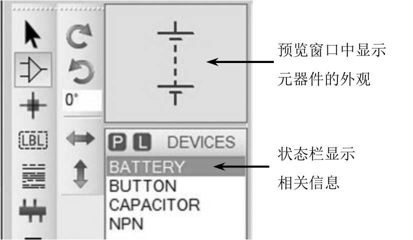 ·在对象选择器中,单击“BATTERY”,即选中BATTERY元器件,此时在预览窗口出现所选元器件的外观,同时状态栏显示对象选择器及预览窗口的状态,如图2-25所示。