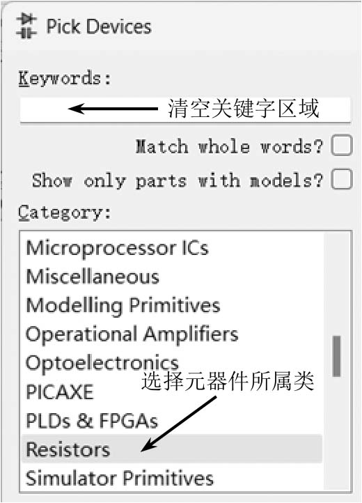 ·通过索引系统查找库元器件。当用户不确定元器件的名称或不清楚元器件的描述时,可采用这一方法。先清除“Keywords”区域的内容,然后选择“Category”目录中的“Resistors”类,如图2-18所示。