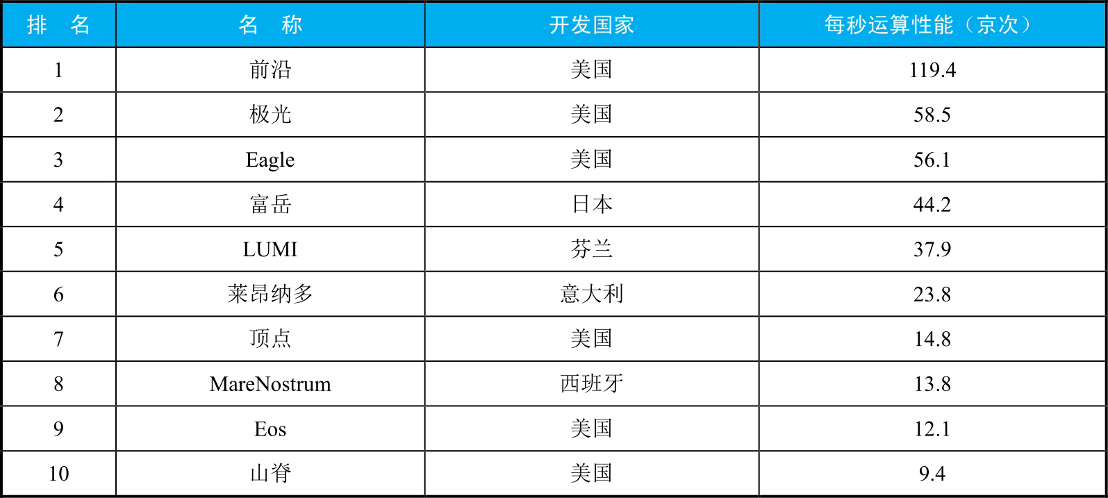 超级计算机是经典计算机中功能最强、运算速度最快、存储容量最大的一类计算机,多用于国家高科技领域和尖端技术研究,是国家科技发展水平和综合国力的重要标志。2023年,世界主要经济体在超级计算机领域的争夺仍然激烈。同时,超级计算机的应用场景不断拓展、任务难度不断加大。2023世界超算排名如表2-4所示。