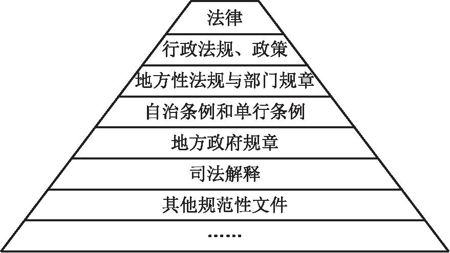寻找规范看起来是寻找某个适合于事实的规范,实则涉及全体法律制度。这就首先产生到哪里去找法源的问题。法源也可称作法的渊源或法的材料。2009年最高人民法院《关于裁判文书引用法律、法规等规范性法律文件的规定》(法释〔2009〕14号)也间接说明了法源顺序,其第2条规定:“并列引用多个规范性法律文件的,引用顺序如下:法律及法律解释、行政法规、地方性法规、自治条例或者单行条例、司法解释。同时引用两部以上法律的,应当先引用基本法律,后引用其他法律。”另外,据第6条,对于其他规范性文件,根据审理案件的需要,经审查认定为合法有效的,可以作为裁判说理的依据。如图1-1所示。