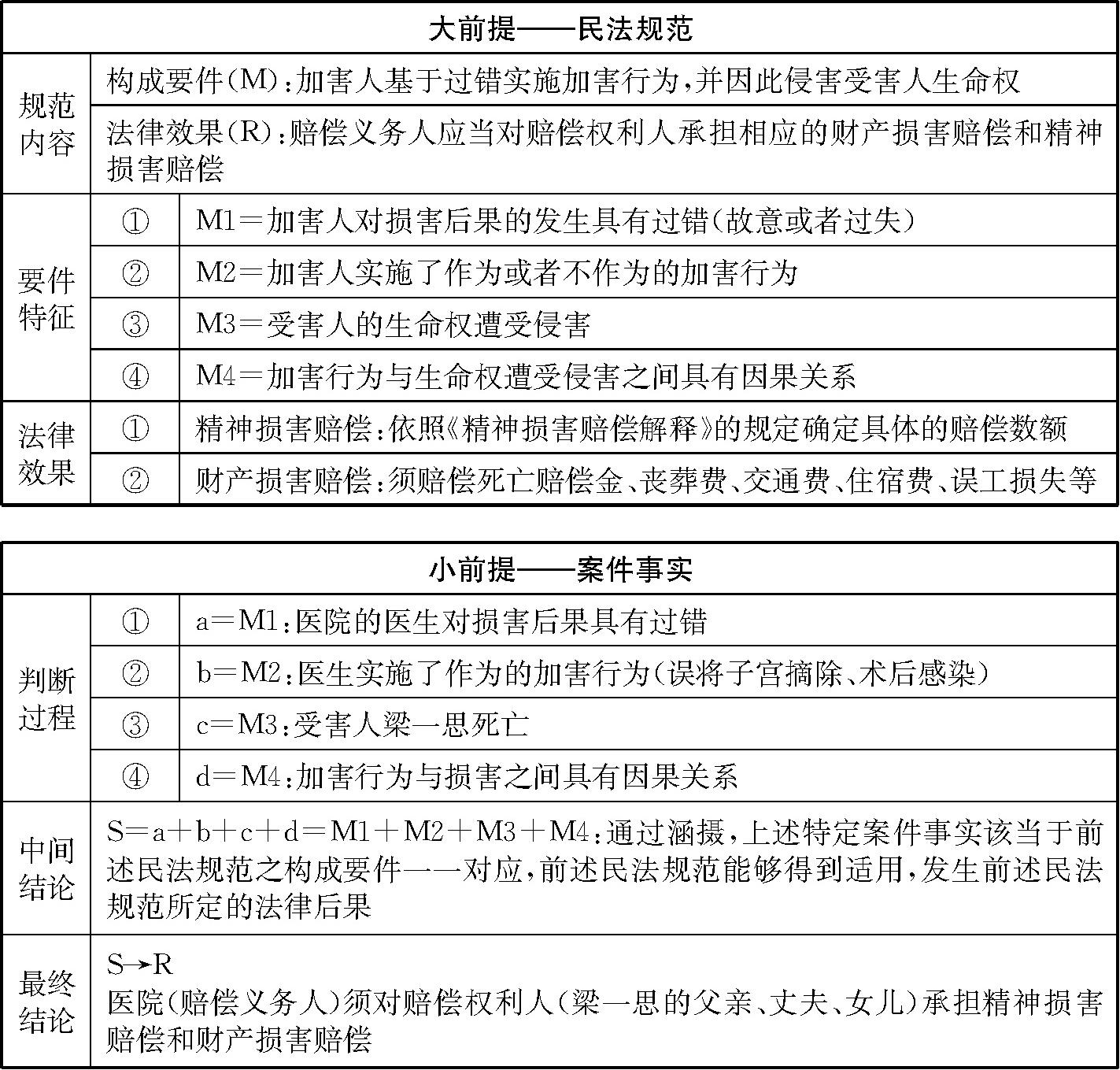 以上三段论,如果运用到具体案件中,就是:法律法规或司法解释关于某种法律事实的规定以及该规定所对应的效果是大前提,案件事实是小前提,如果案件事实经过推理确定符合法律法规或司法解释关于某种法律事实的,则同样产生法律法规或司法解释关于某种法律事实对应的效果。 案例中女婴梁小思具有民事权利能力,依法享有肖像权和隐私权等民事权利。推理如下:
