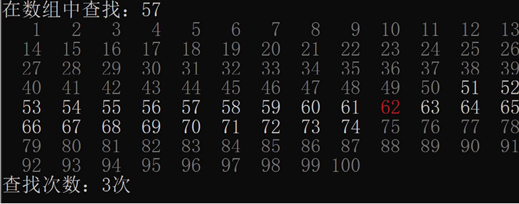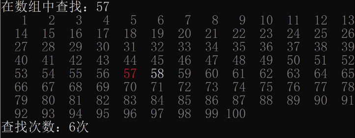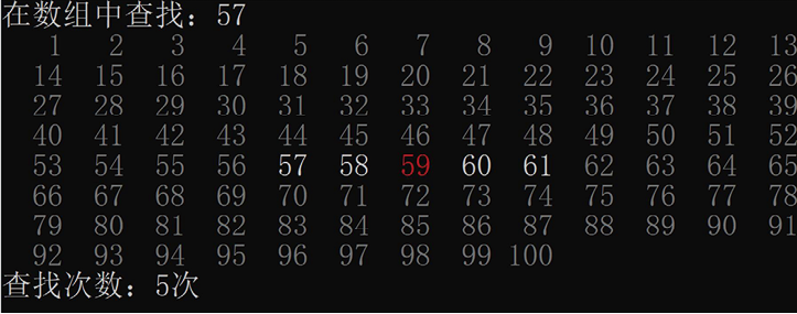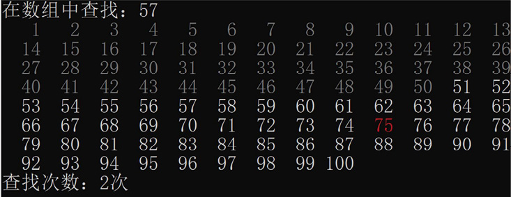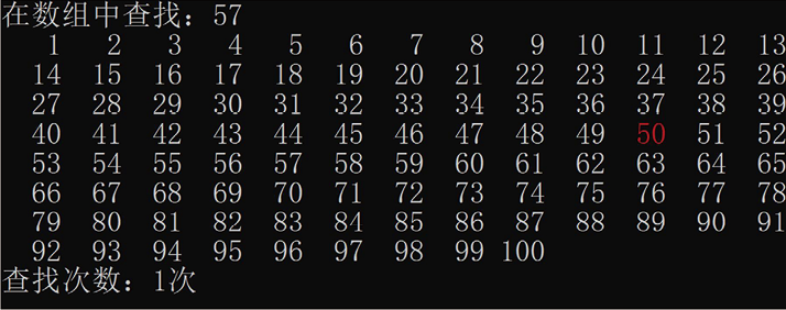 27 printf("\n查找次数:%d次\n", searchNUM); // 输出白色提示文字