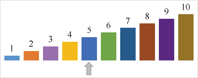 首先,将所需查找的数字6和数组正中间位置的元素5进行比较,如图1-11所示。