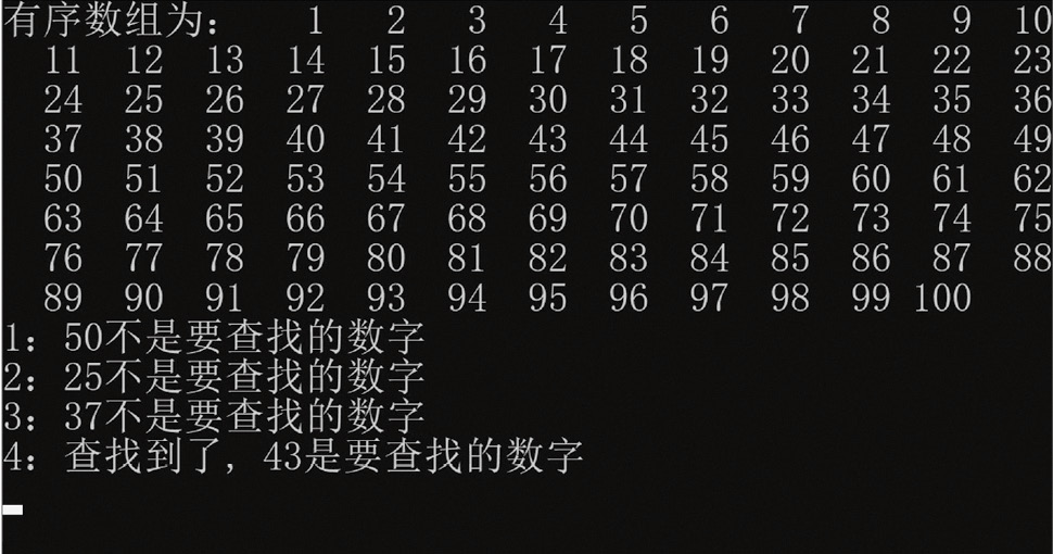 将1-2-2.cpp和1-3-1.cpp结合,即可实现对二分查找算法的动态过程的可视化,如代码1-3-2.cpp所示,运行效果参见图1-17,扫描右侧二维码观看视频效果“1.3 二分查找”。