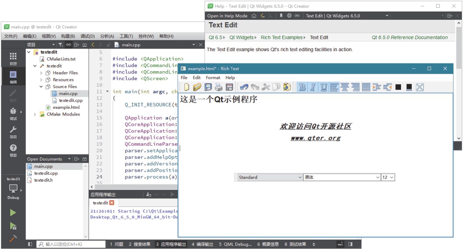 或者按下Ctrl + R快捷键,则程序开始编译运行,相关信息会显示在下面的“编译输出”和“应用程序输出”窗口中。“Text Edit”示例程序运行效果如图1-5所示。