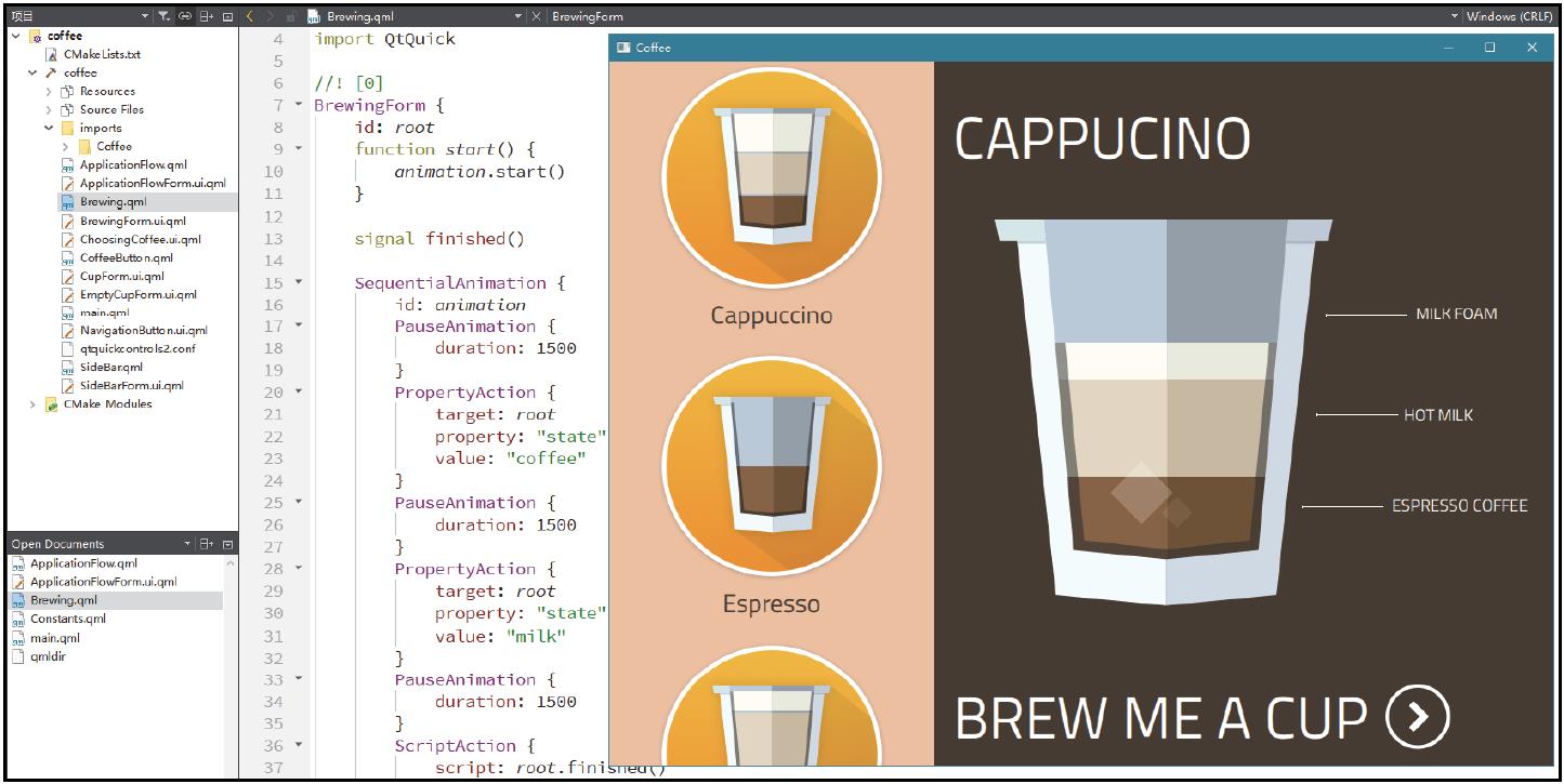 要查找Qt Quick相关示例程序,可以在搜索栏中输入“quick”关键字,然后选择一个比较感兴趣的示例程序,比如“Coffee Machine”。在编辑模式下,用户可以查看该示例的源代码,以.qml为扩展名的文件就是QML文件,读者可以对比一下其C++和QML代码实现。程序运行效果如图1-6所示。可以看到,Qt Quick应用的界面非常漂亮,并且其中的动画、滑动等效果在传统Qt Widgets程序中是很难实现的。
