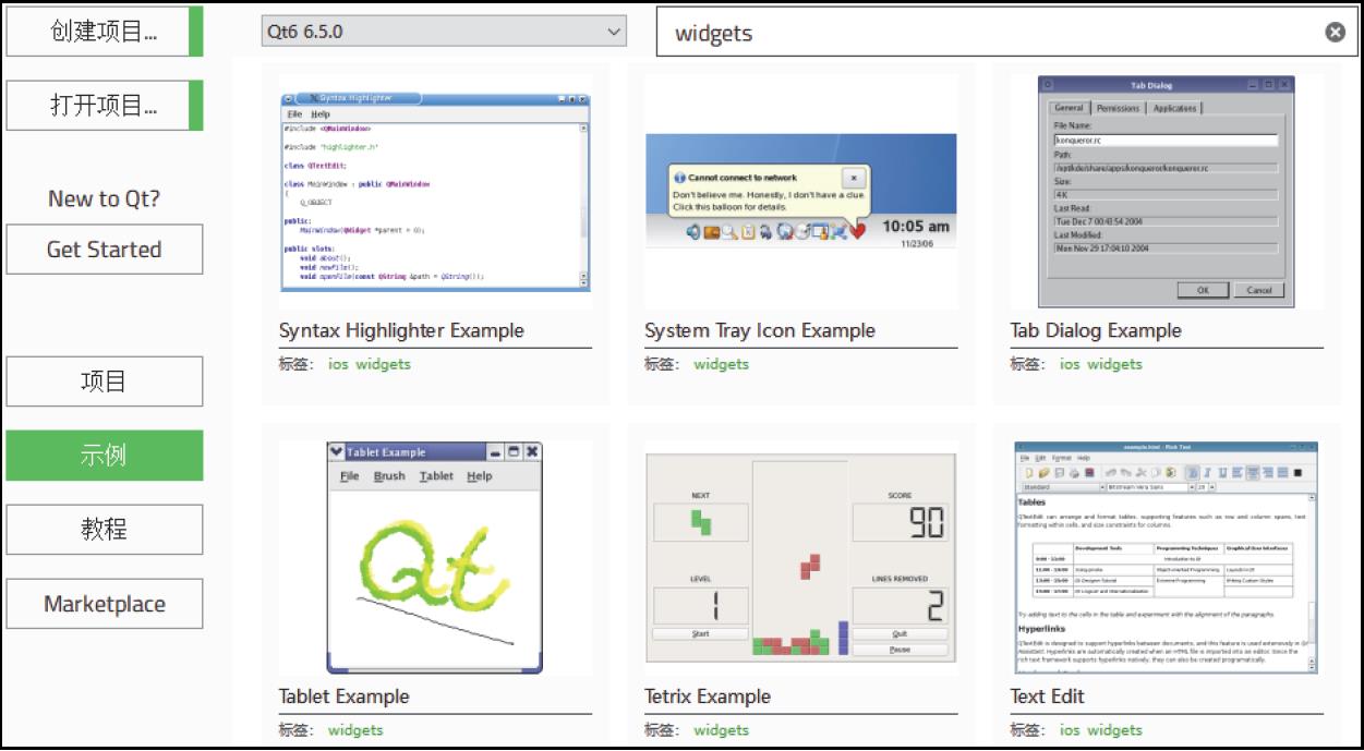其实,除了Qt Quick应用,大部分应用都可以称为Qt Widgets应用,这里为了查看比较典型的Widgets应用,我们在搜索栏中输入“widgets”关键字,结果如图1-4所示。